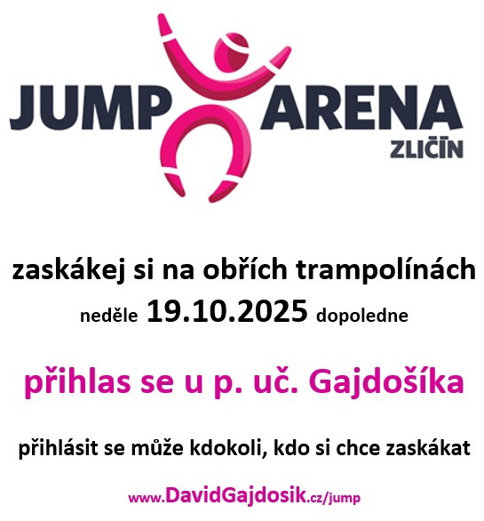 V neděli 19.10.2025 si zájemci mohou zajít zaskákat na obřích trampolínách do Jump arény v Praze na Zličíně. Skákat budeme od 10:00 do 11:00 h.